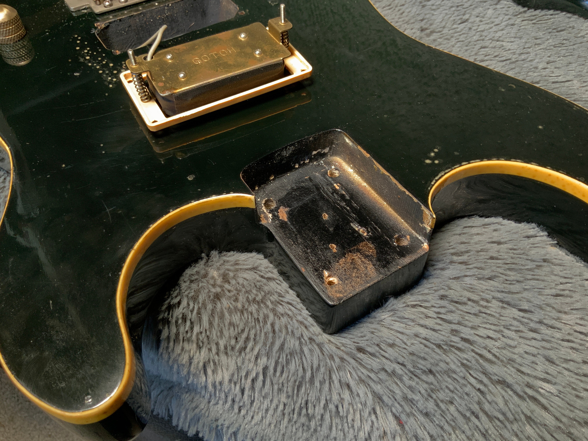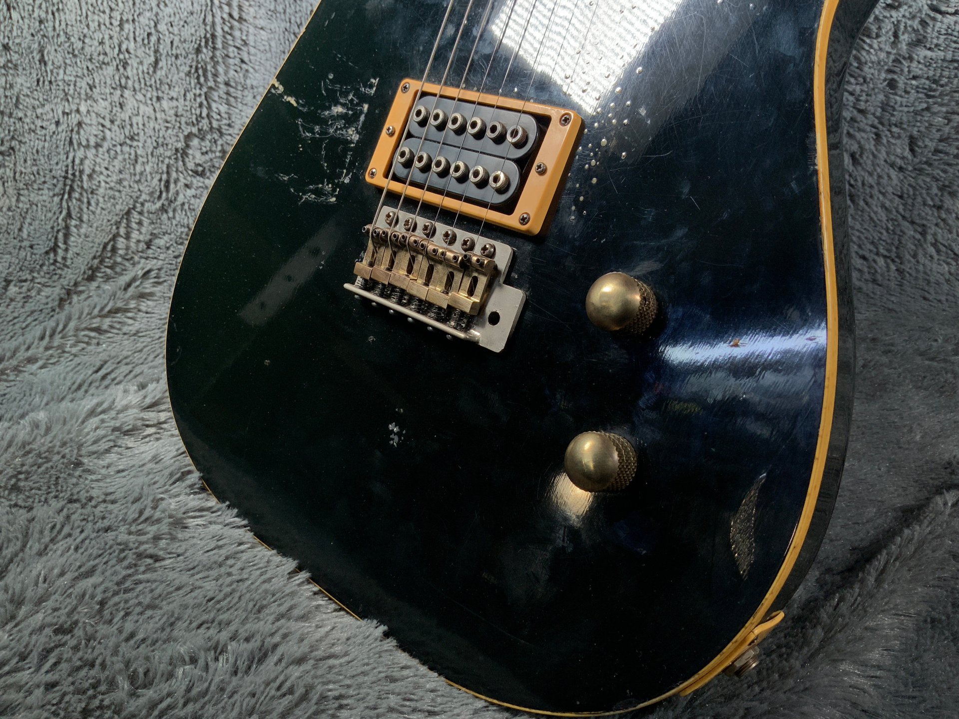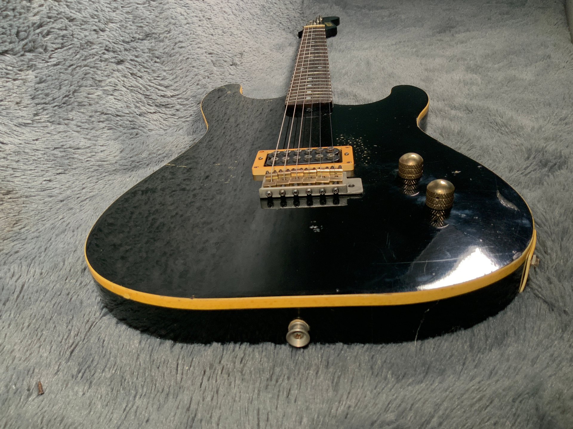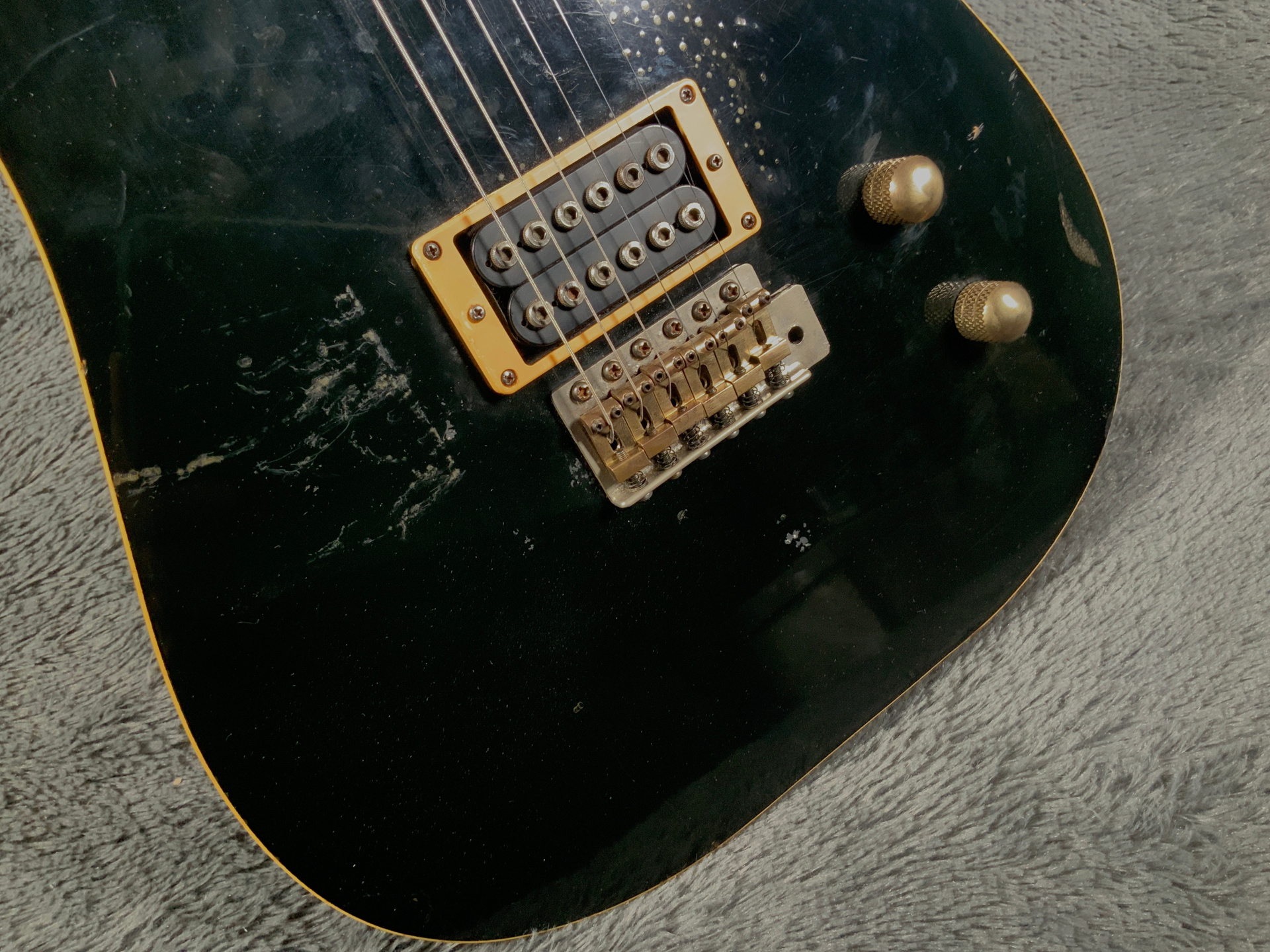 Интересный инструмент из последнего четвертого поколения — считается лучшим у Fresher. Корпус красное дерево, гриф клен/палисандр 21 лад. Мензура 645 мм, верхний порожек 41 мм, вес 3,5 кг. Звукосниматель Gotoh Humbucker. Управление громкость и тон. Технически в порядке, гриф ровный, анкер рабочий, лады отполированы, накладка чистая, электроника в норме. Струны низко, играть легко, звучит хорошо. Внешне много ушибов, царапин, потертостей, сколов, струны старые — под замену