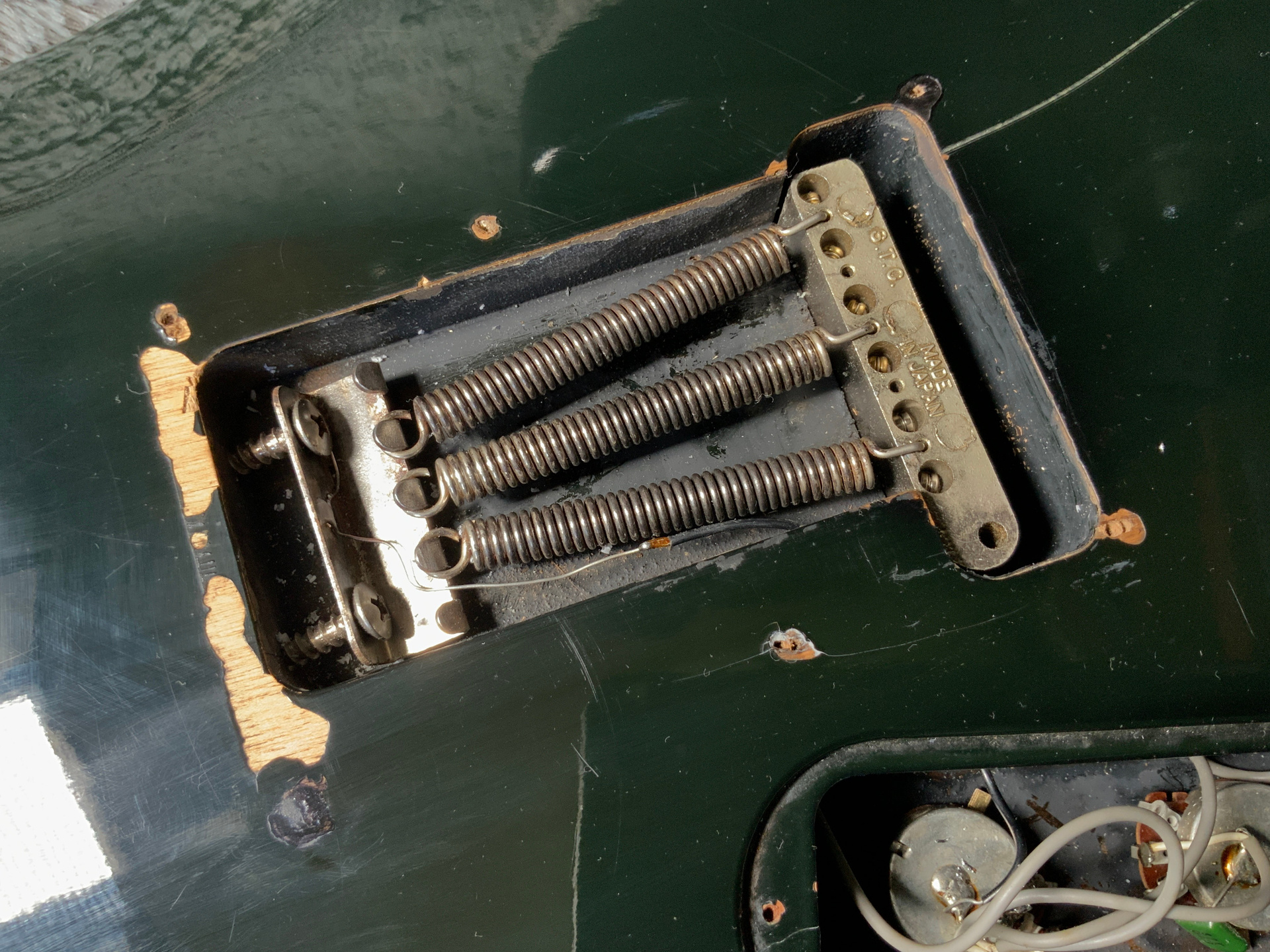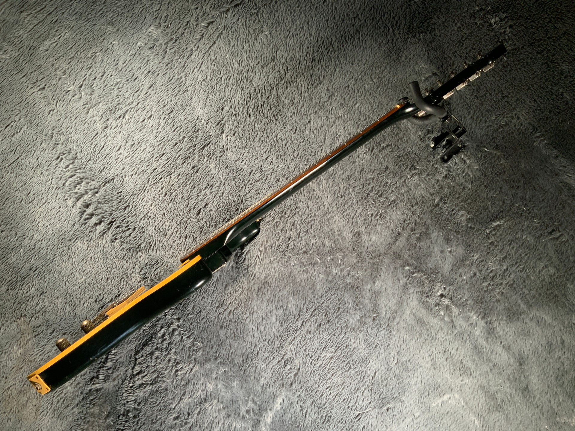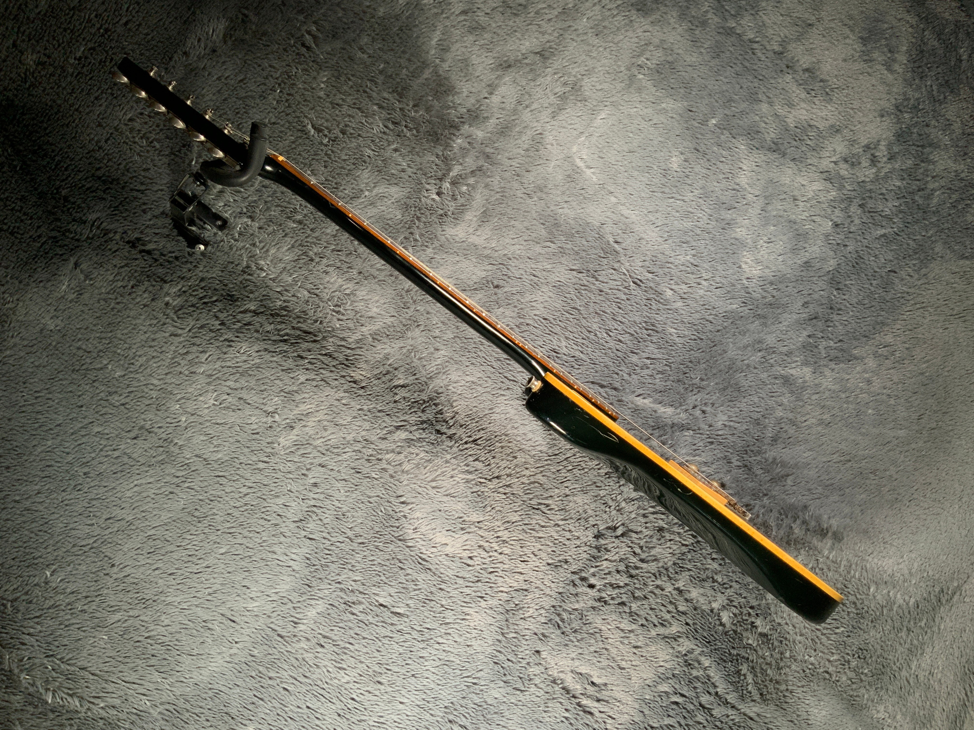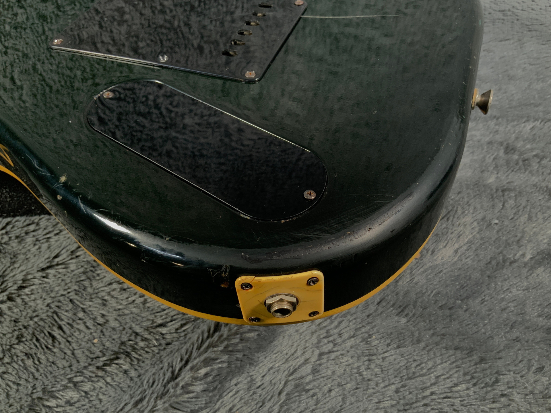 Интересный инструмент из последнего четвертого поколения — считается лучшим у Fresher. Корпус красное дерево, гриф клен/палисандр 21 лад. Мензура 645 мм, верхний порожек 41 мм, вес 3,5 кг. Звукосниматель Gotoh Humbucker. Управление громкость и тон. Технически в порядке, гриф ровный, анкер рабочий, лады отполированы, накладка чистая, электроника в норме. Струны низко, играть легко, звучит хорошо. Внешне много ушибов, царапин, потертостей, сколов, струны старые — под замену