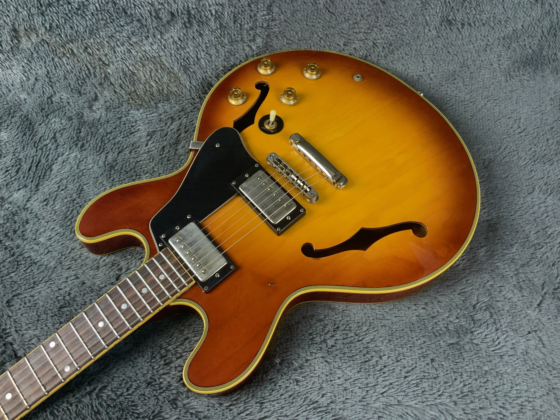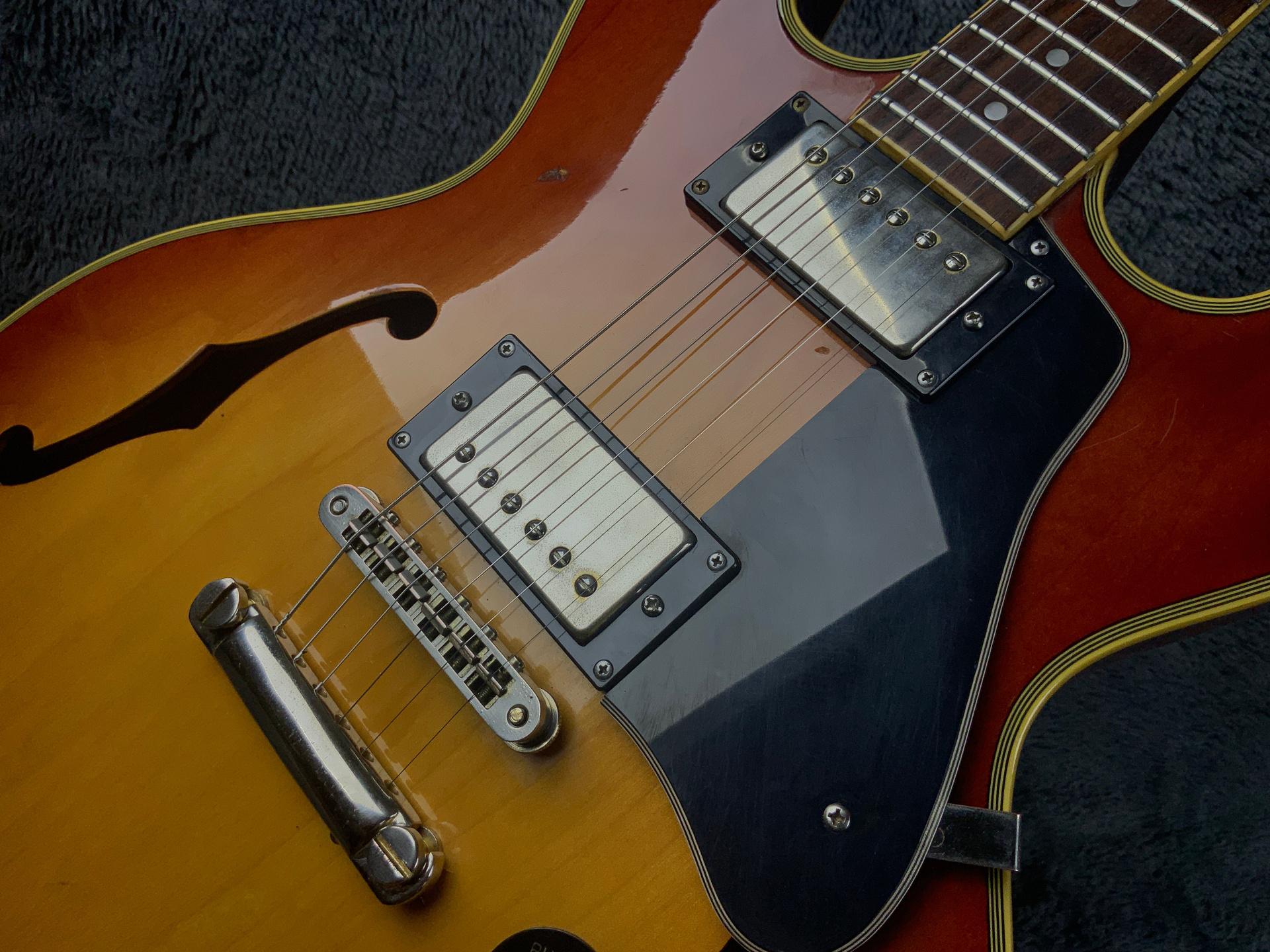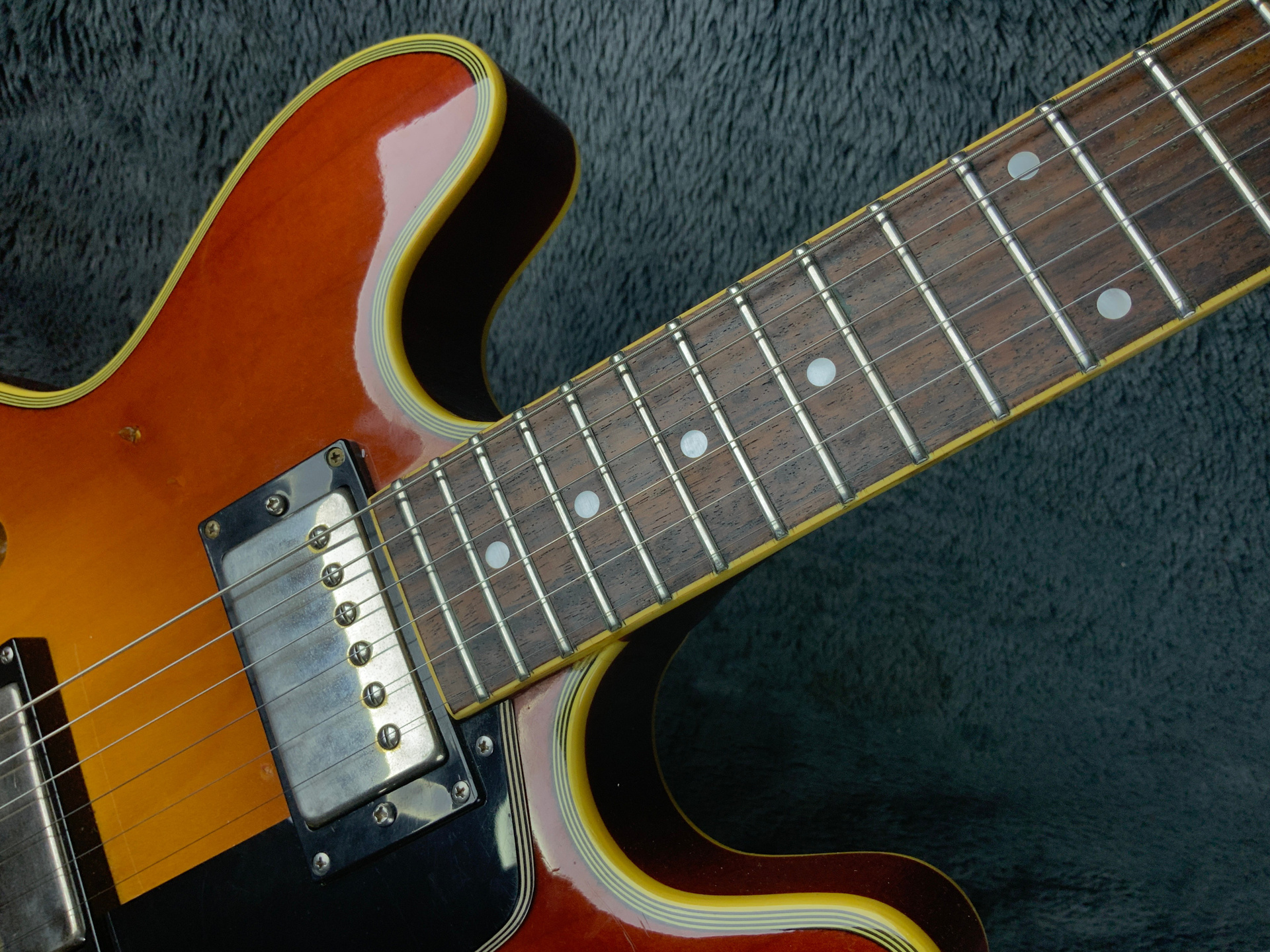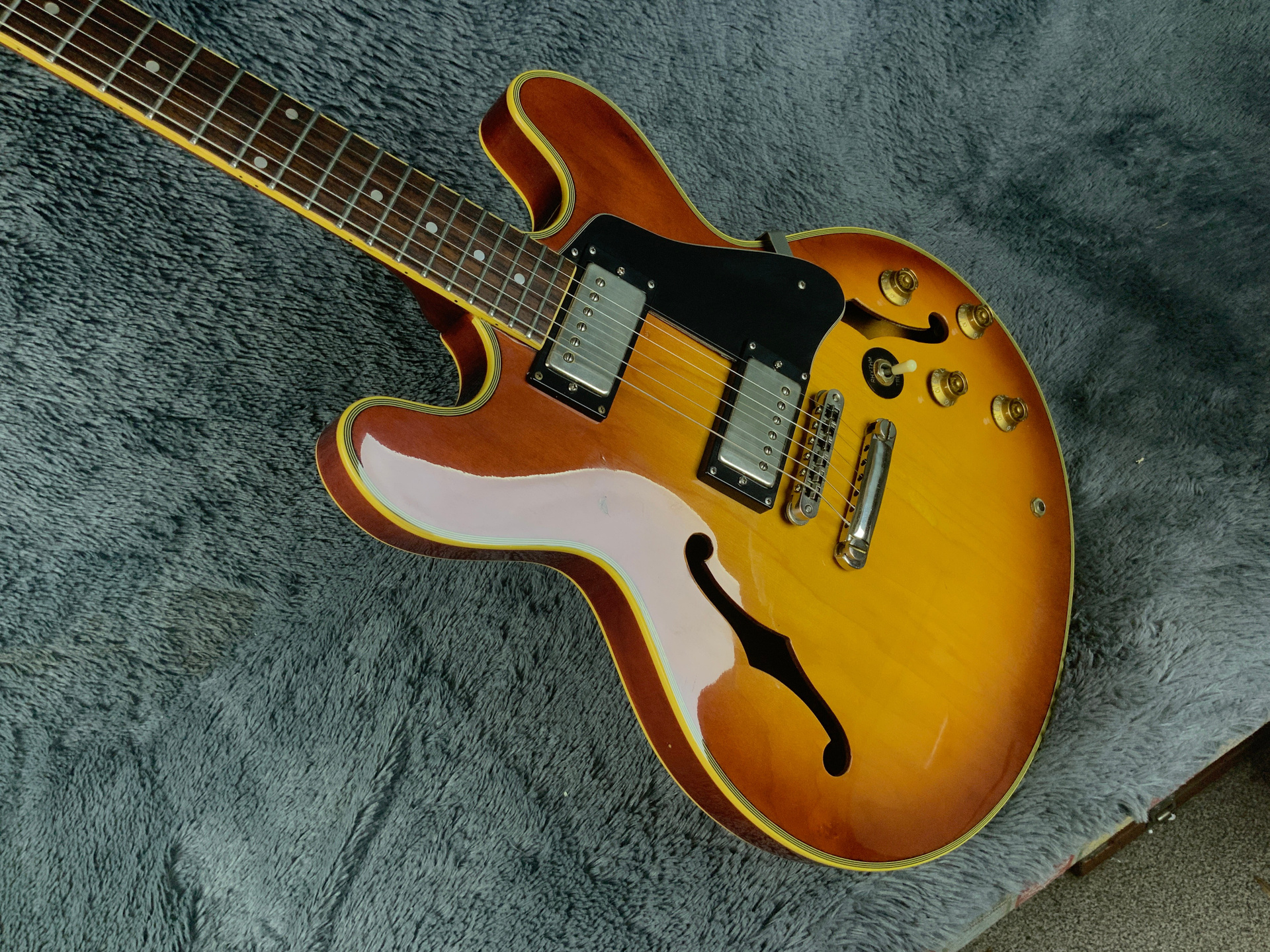 Электрогитара в красивом окрасе, хорошо построена — арочный корпус с центральным блоком Semi-Hollow Body. Мензура 630 мм, верхний порог 43 мм, вес 3,6 кг. Технически в норме, гриф ровный, накладка чистая, лады без износа, анкер рабочий, электроника в порядке. Внешне в целом все хорошо — есть некритичные трещины лака, сколы, царапины, потертости, патина на фурнитуре