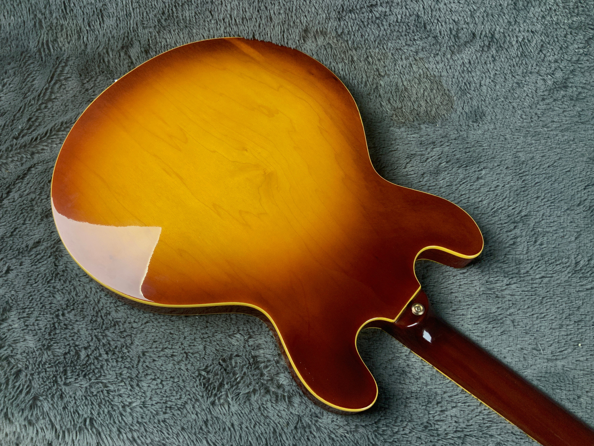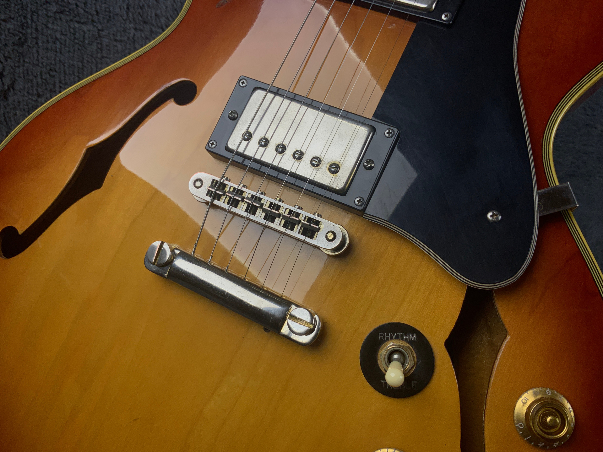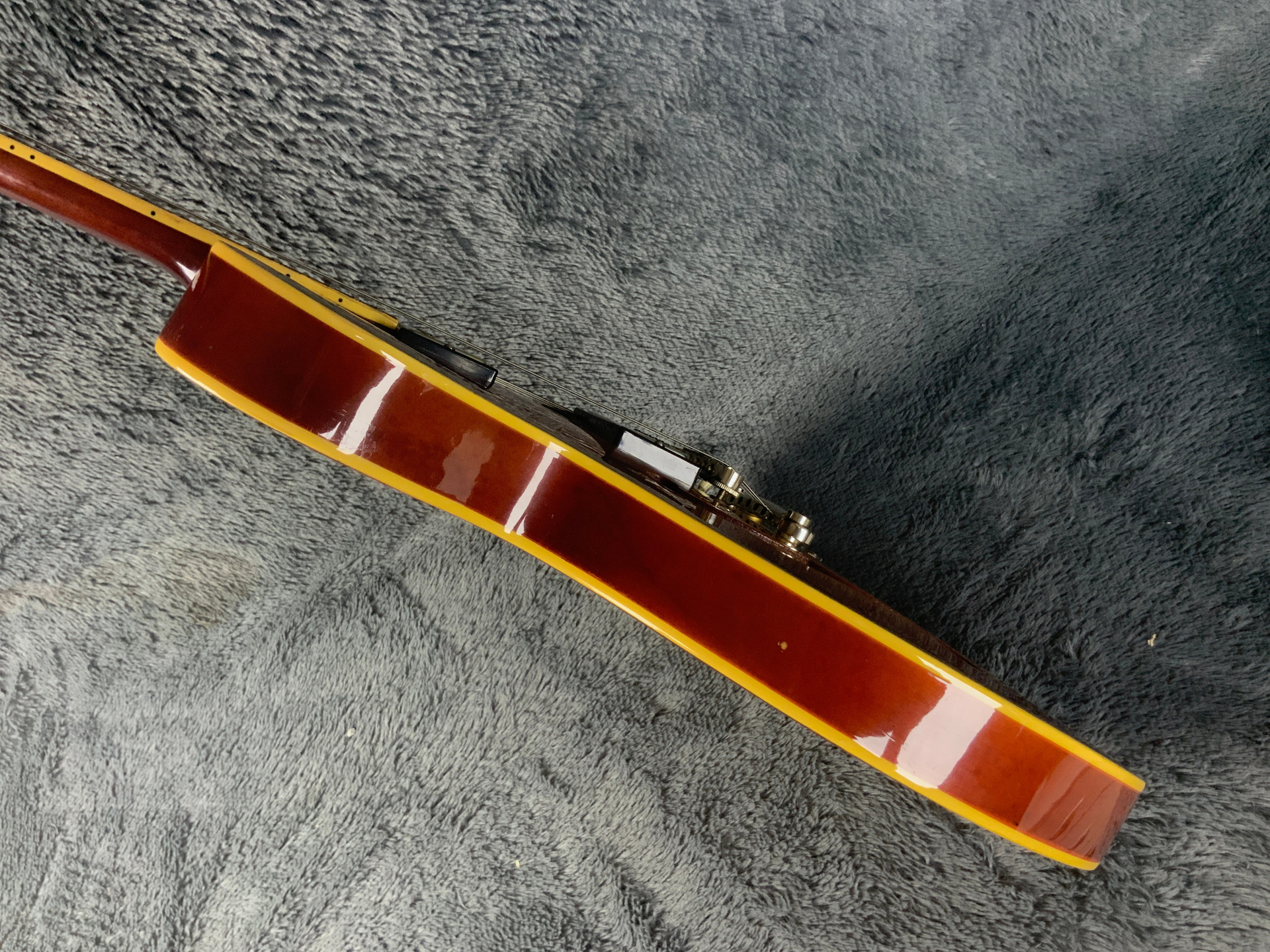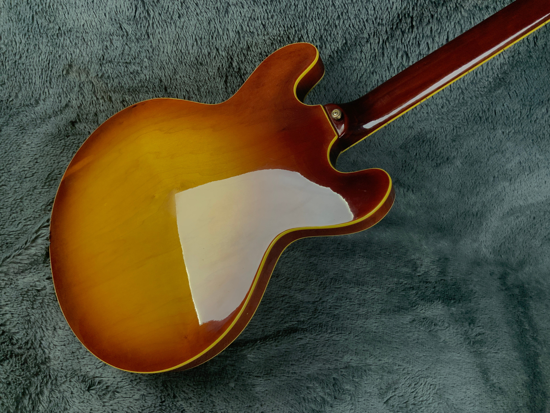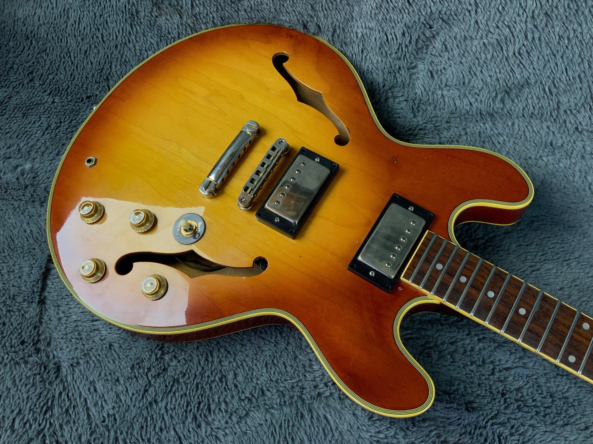 Электрогитара в красивом окрасе, хорошо построена — арочный корпус с центральным блоком Semi-Hollow Body. Мензура 630 мм, верхний порог 43 мм, вес 3,6 кг. Технически в норме, гриф ровный, накладка чистая, лады без износа, анкер рабочий, электроника в порядке. Внешне в целом все хорошо — есть некритичные трещины лака, сколы, царапины, потертости, патина на фурнитуре