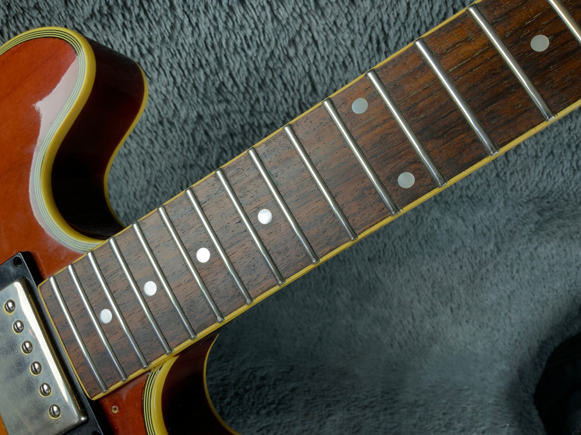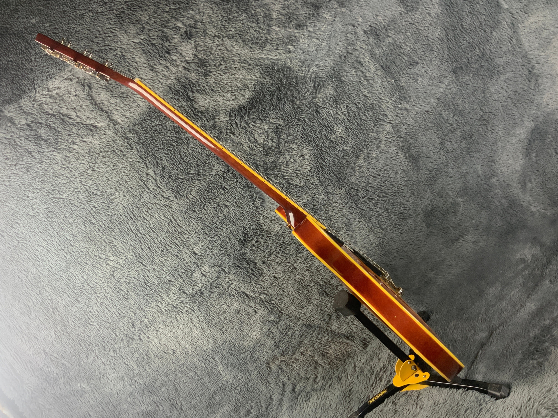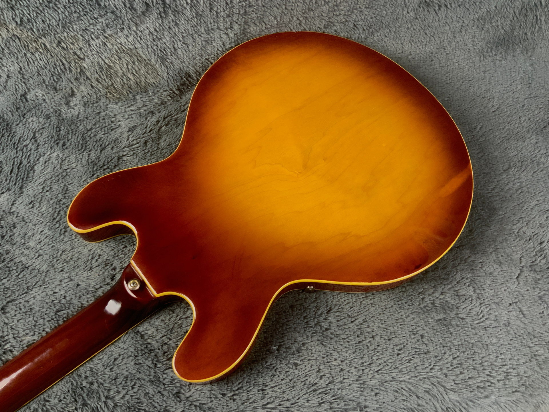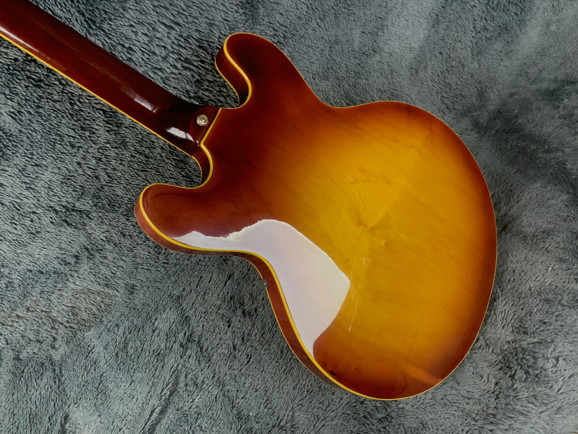 Электрогитара в красивом окрасе, хорошо построена — арочный корпус с центральным блоком Semi-Hollow Body. Мензура 630 мм, верхний порог 43 мм, вес 3,6 кг. Технически в норме, гриф ровный, накладка чистая, лады без износа, анкер рабочий, электроника в порядке. Внешне в целом все хорошо — есть некритичные трещины лака, сколы, царапины, потертости, патина на фурнитуре