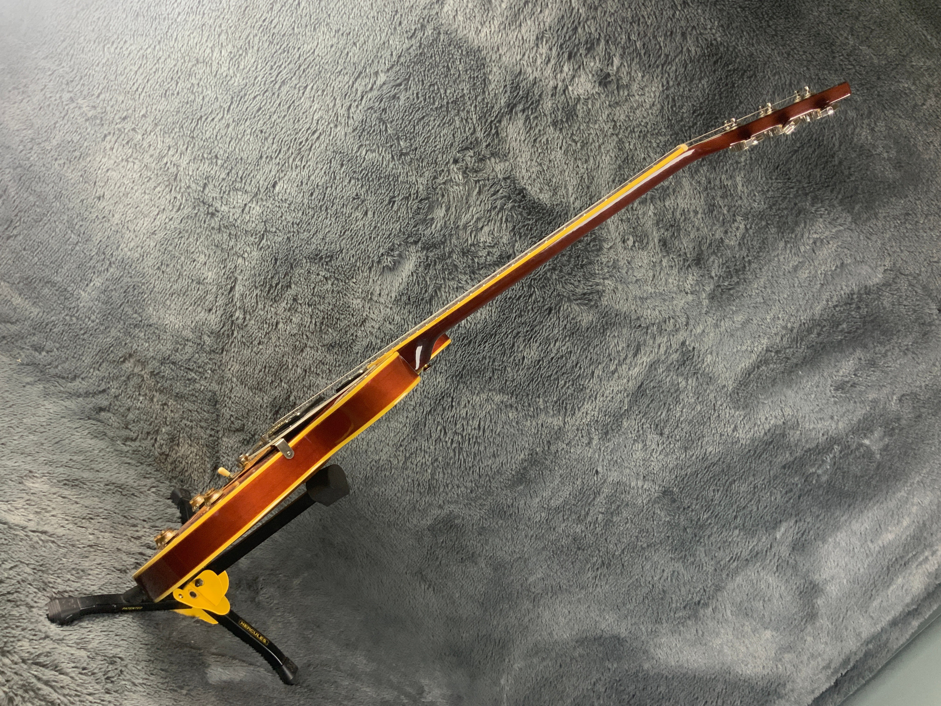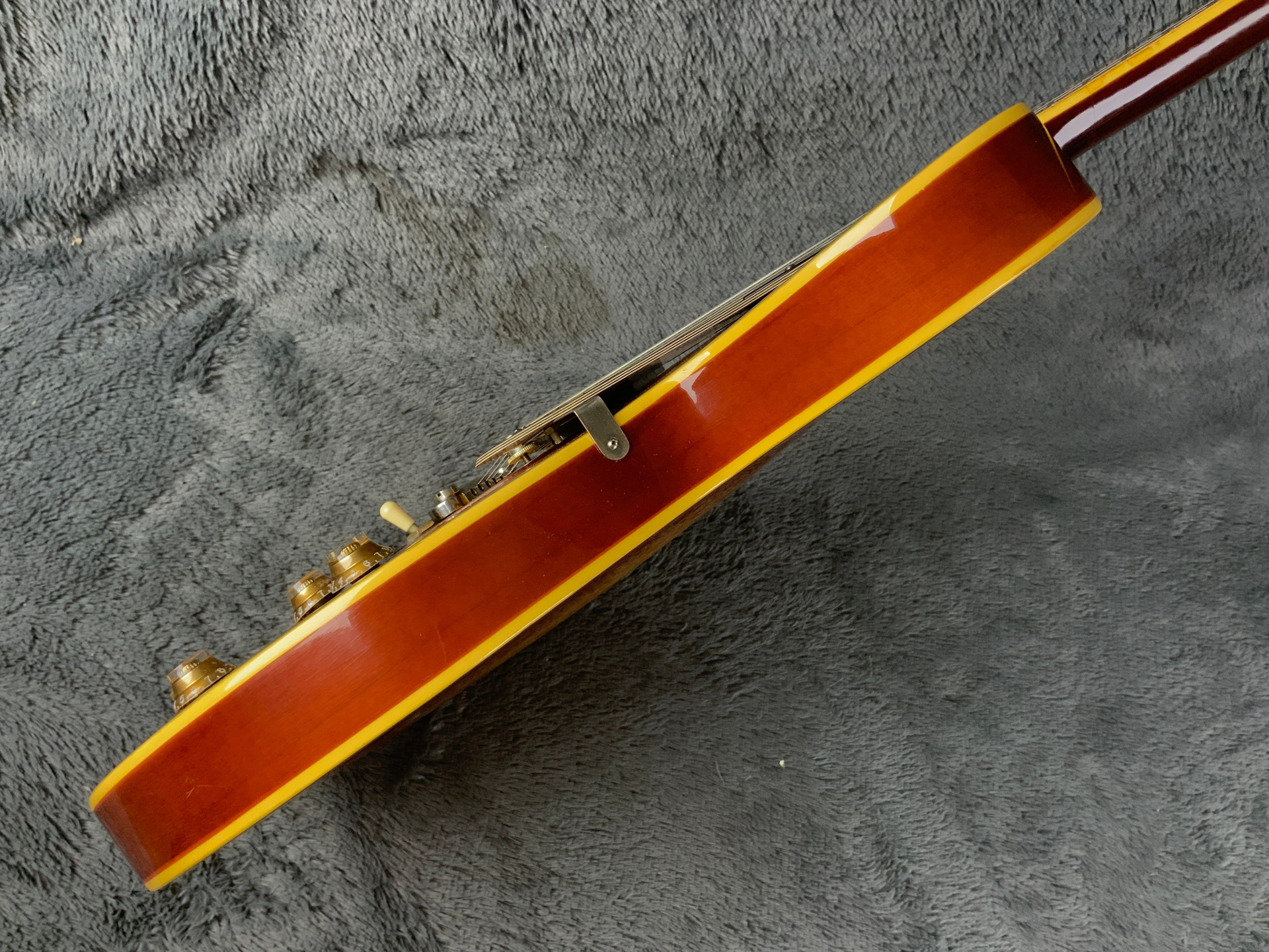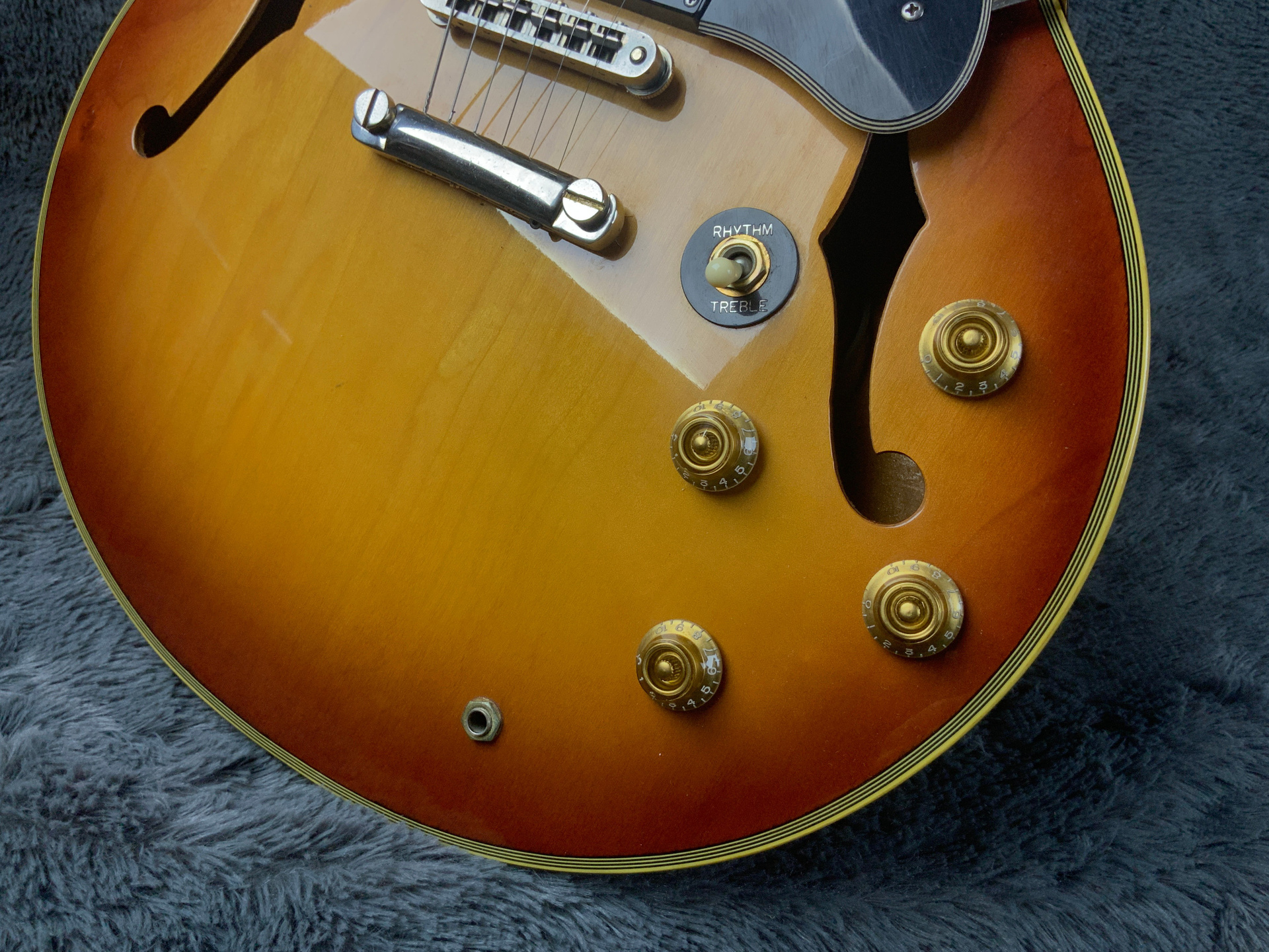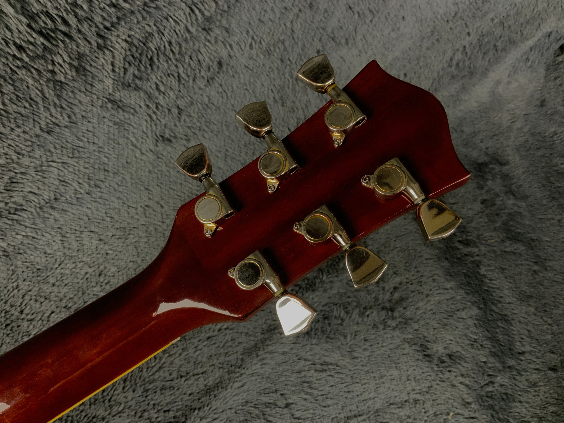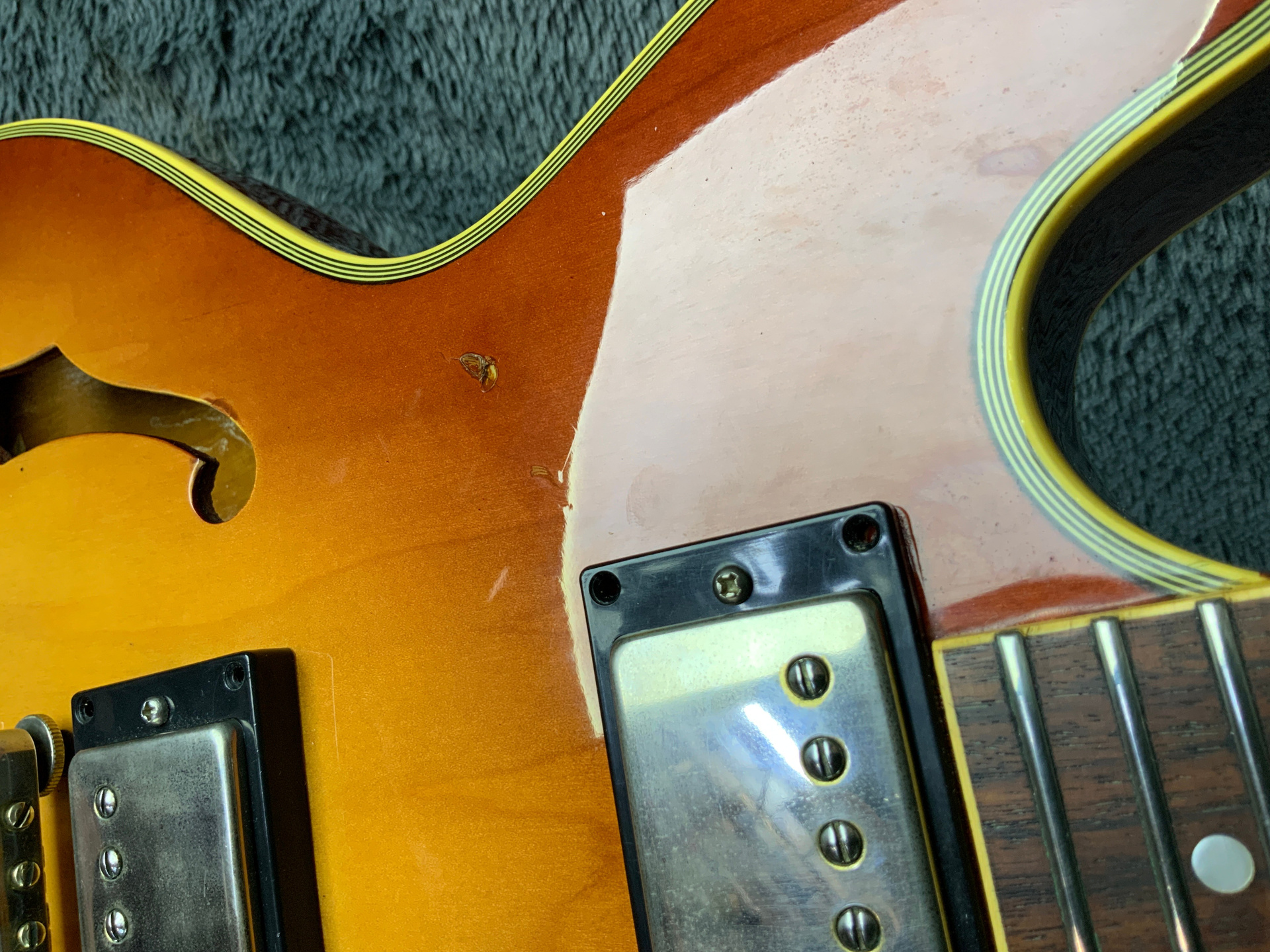 Электрогитара в красивом окрасе, хорошо построена — арочный корпус с центральным блоком Semi-Hollow Body. Мензура 630 мм, верхний порог 43 мм, вес 3,6 кг. Технически в норме, гриф ровный, накладка чистая, лады без износа, анкер рабочий, электроника в порядке. Внешне в целом все хорошо — есть некритичные трещины лака, сколы, царапины, потертости, патина на фурнитуре