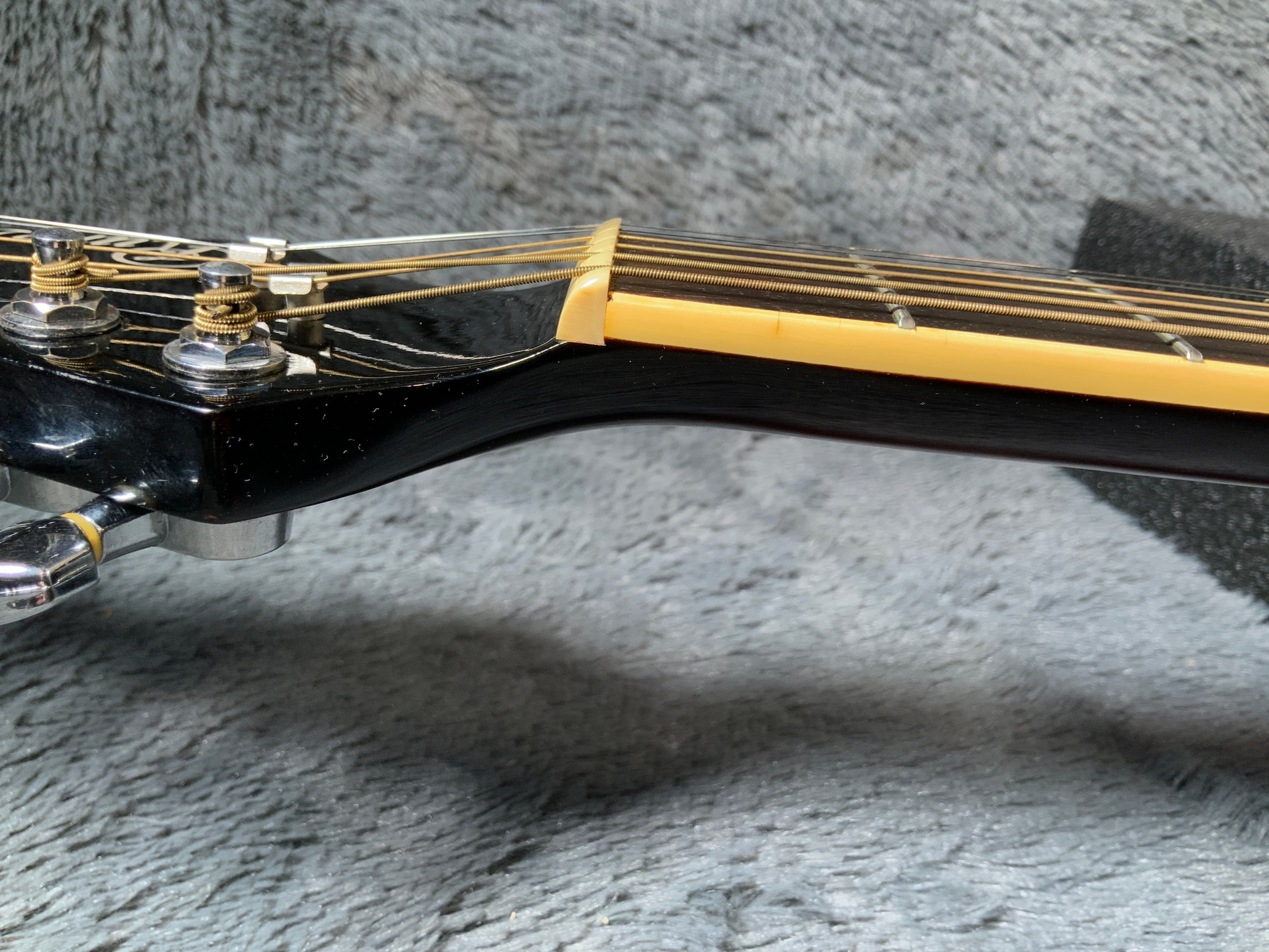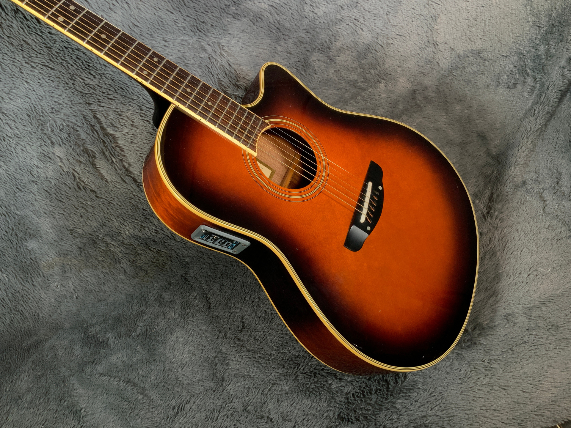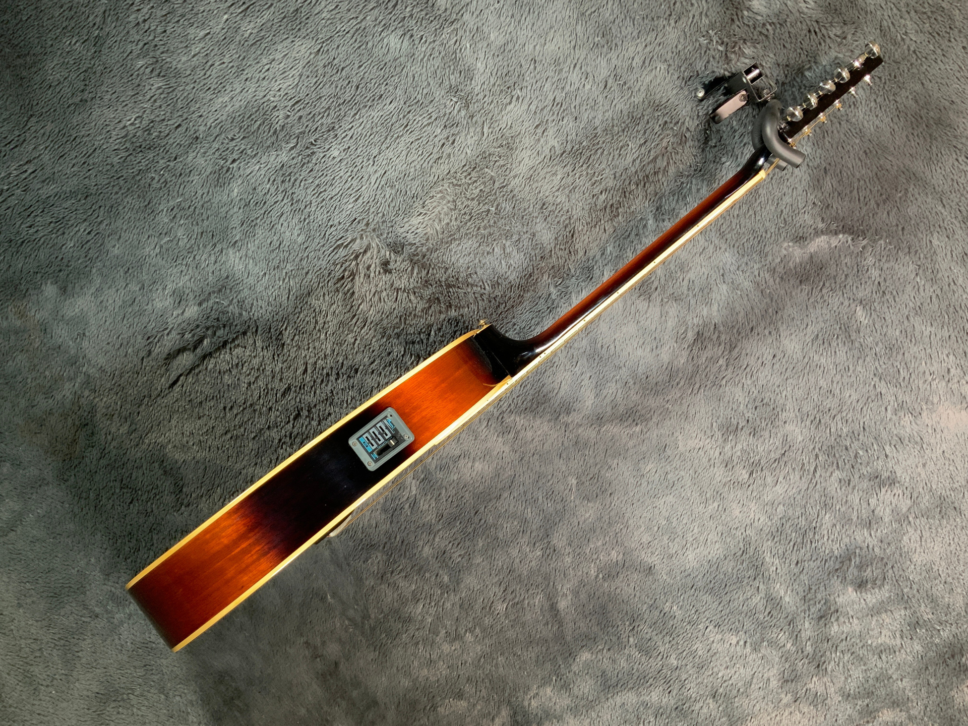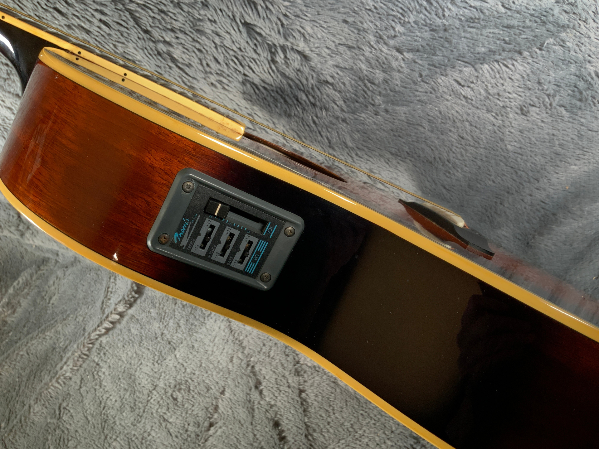 Электроакустическая гитара c активным звукоснимателем и 3-х полосным эквалайзером. Верх ель, низ и обечайки красное дерево, гриф красное дерево с палисандром. Колки Gotoh. Мензура 650 мм, верхний порожек 43 мм, вес 2,2 кг. Состояние хорошее, гриф ровный, анкер рабочий, лады без ям. Есть незначительные царапины, потертости, патина на фурнитуре