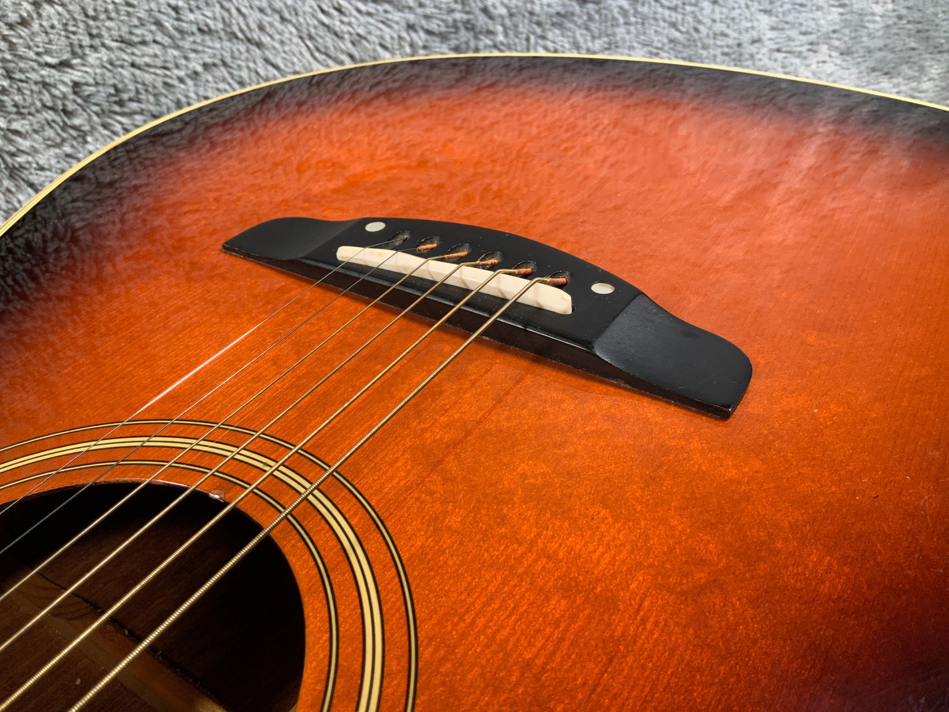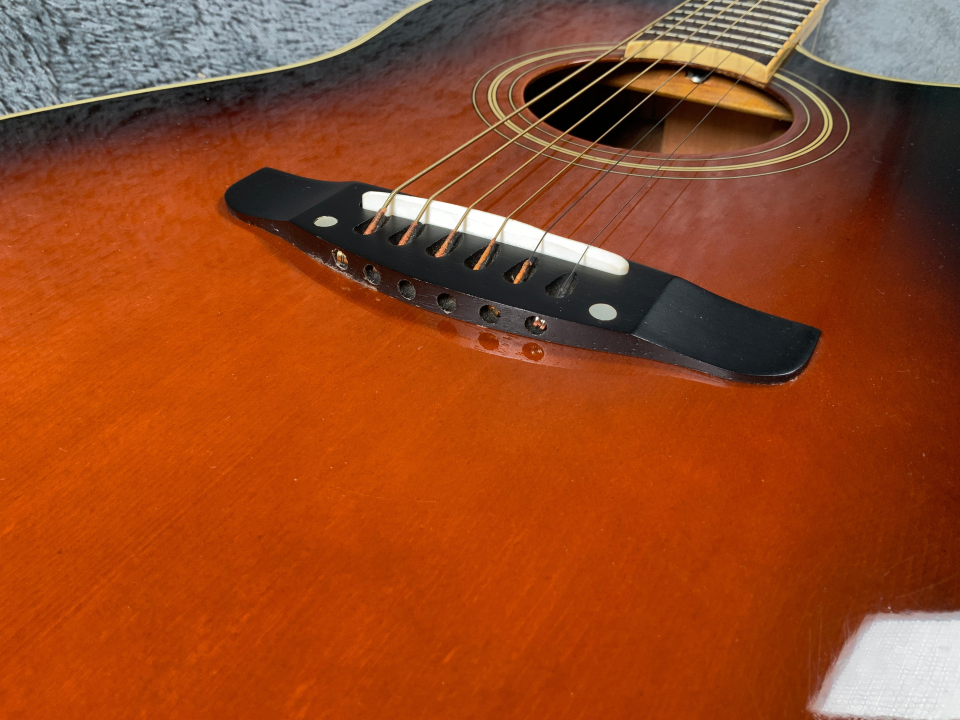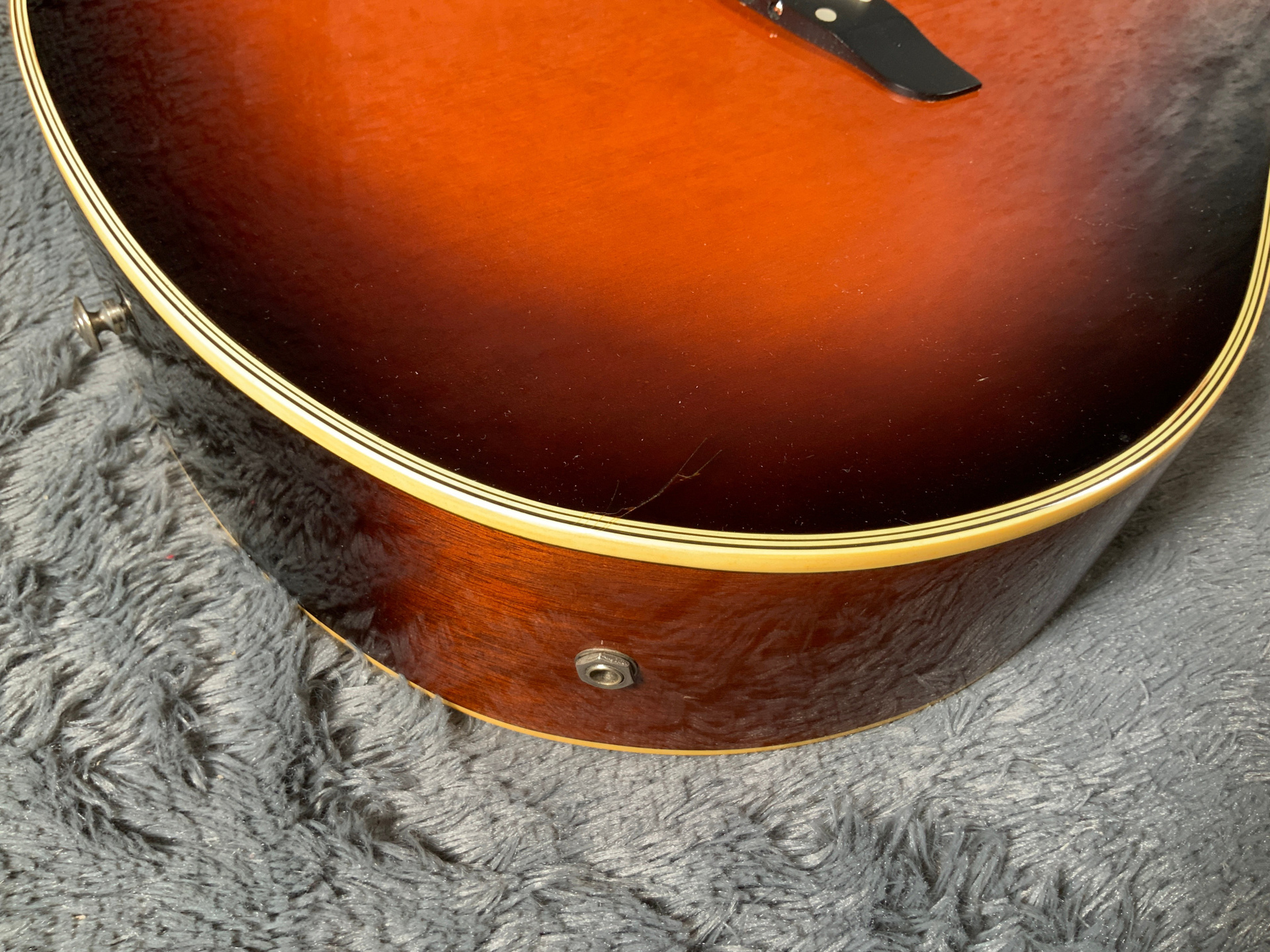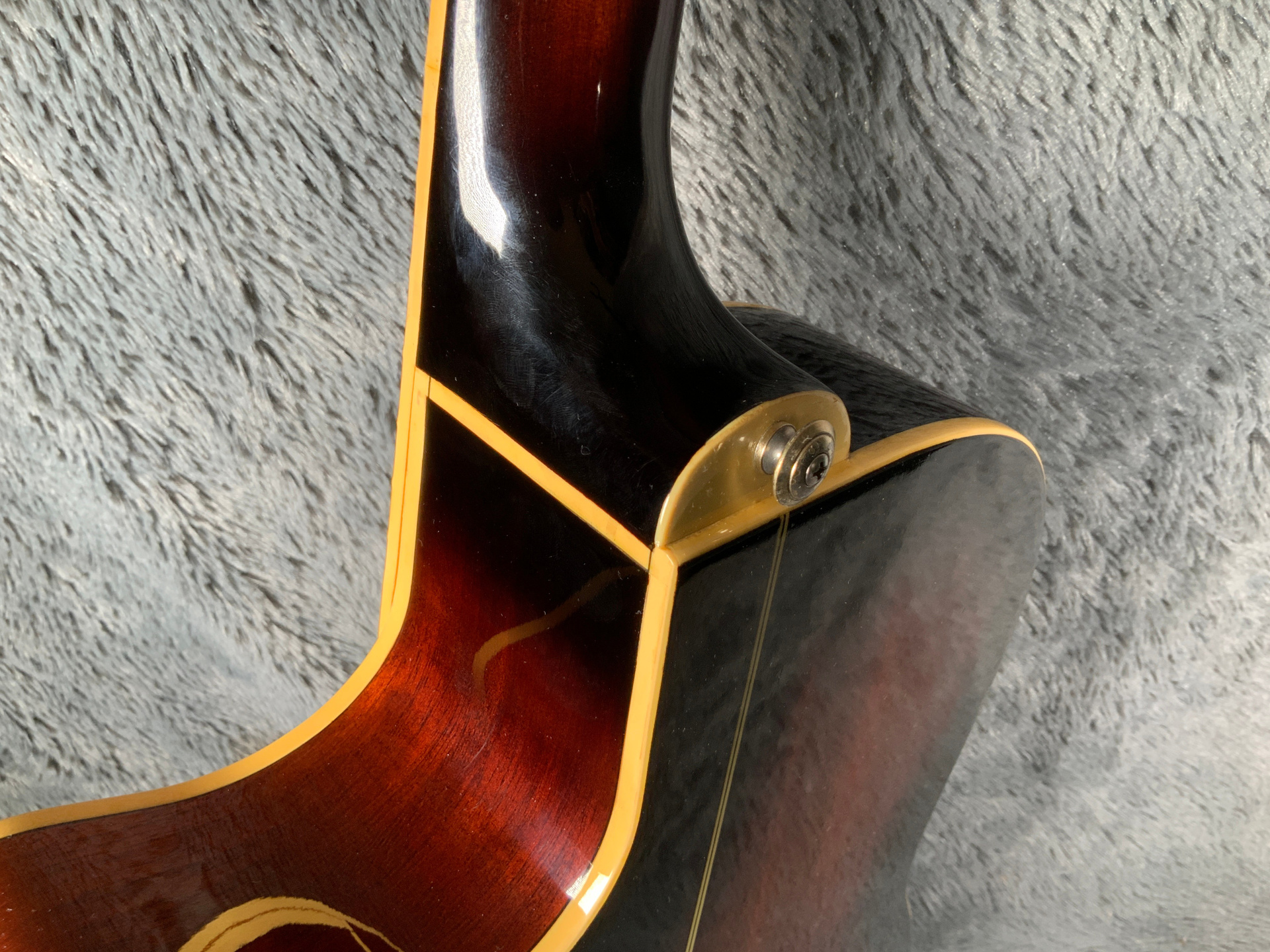 Электроакустическая гитара c активным звукоснимателем и 3-х полосным эквалайзером. Верх ель, низ и обечайки красное дерево, гриф красное дерево с палисандром. Колки Gotoh. Мензура 650 мм, верхний порожек 43 мм, вес 2,2 кг. Состояние хорошее, гриф ровный, анкер рабочий, лады без ям. Есть незначительные царапины, потертости, патина на фурнитуре