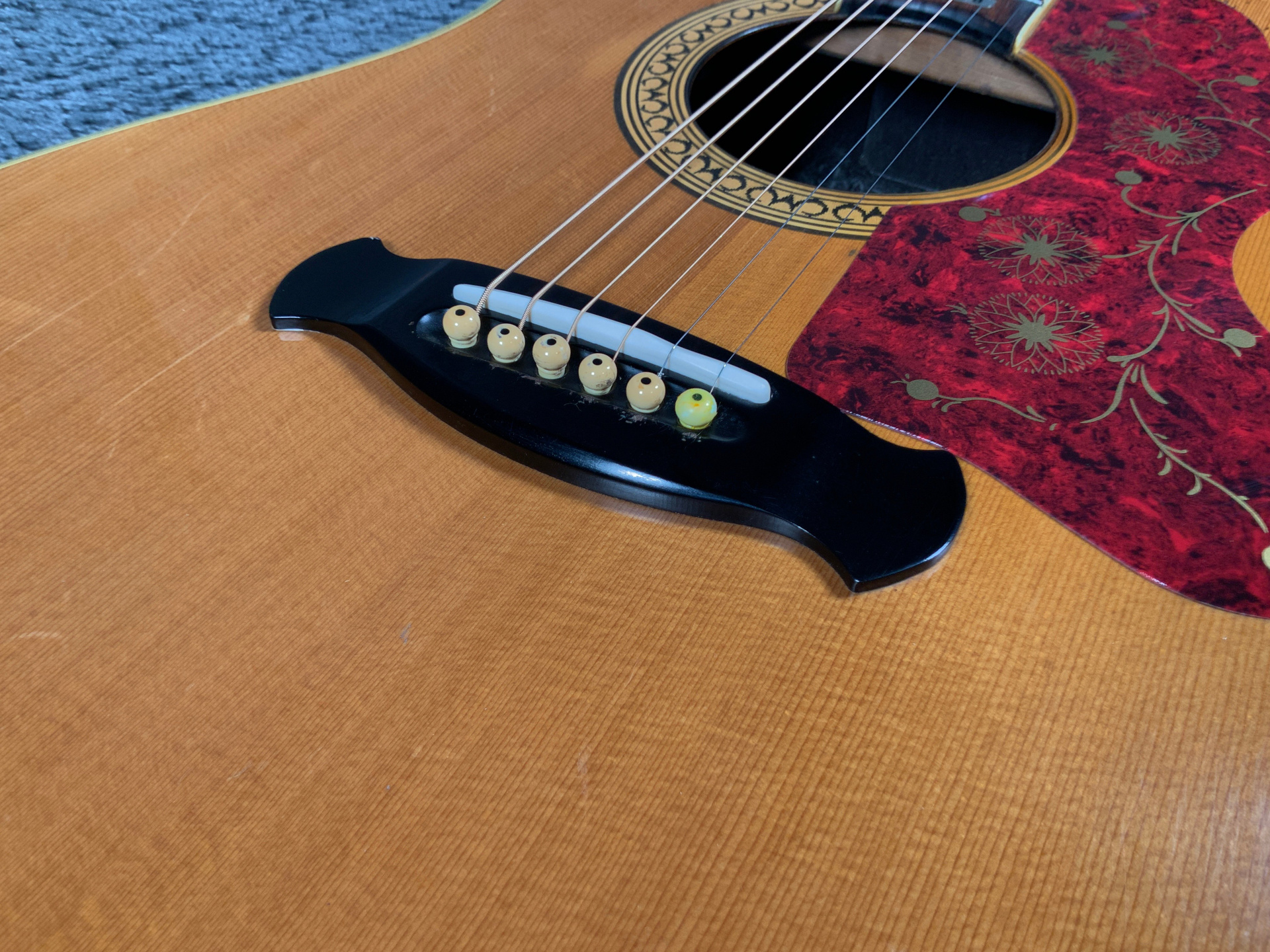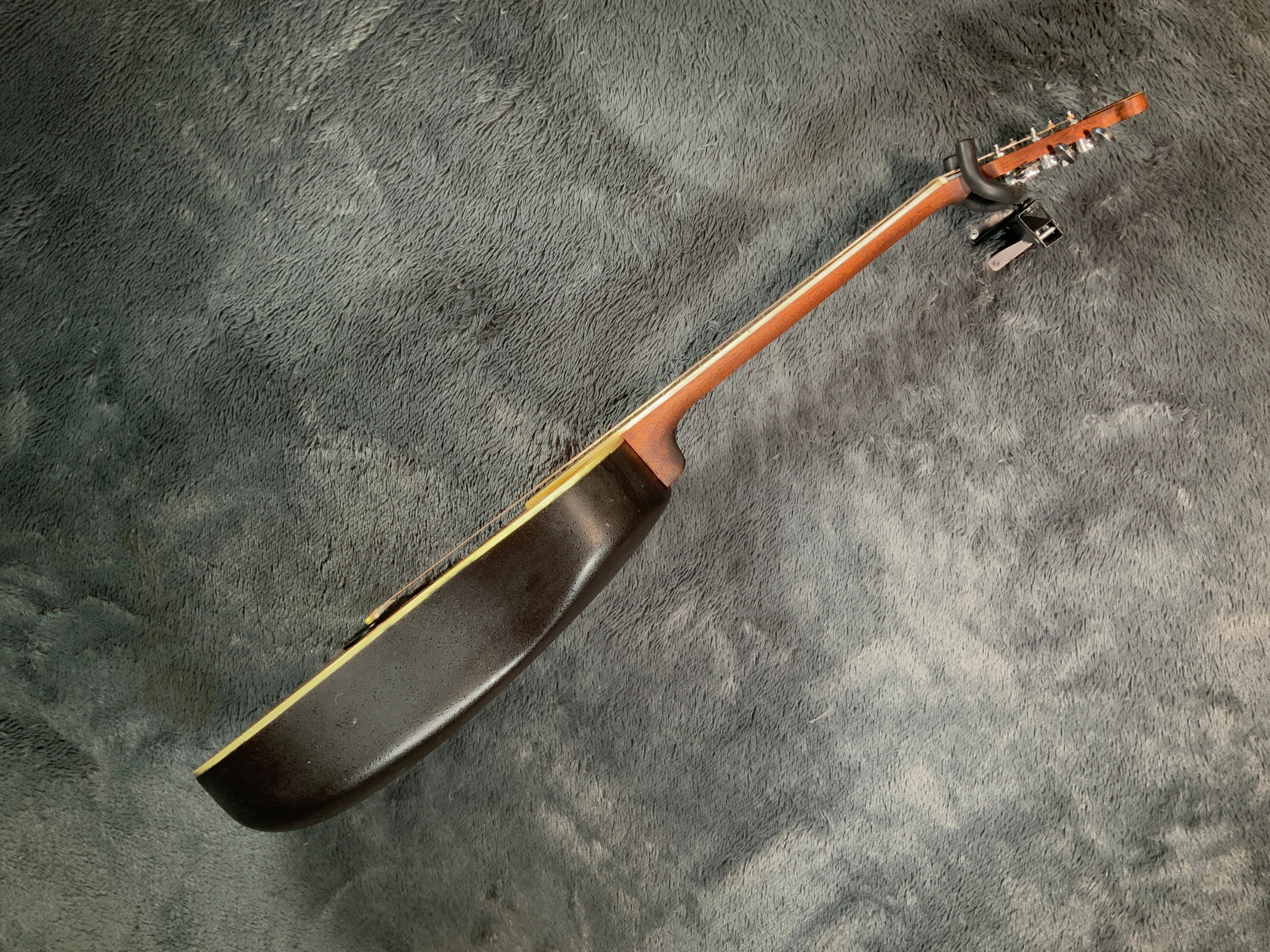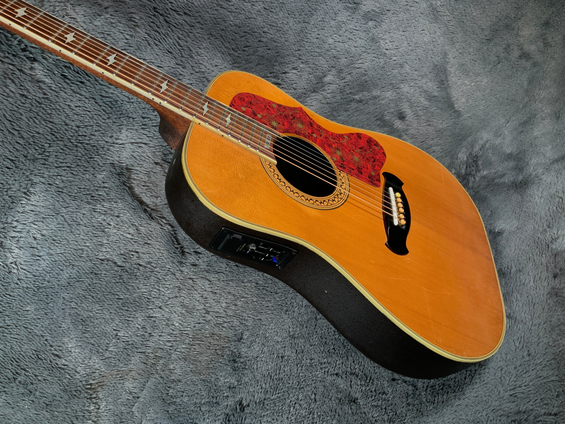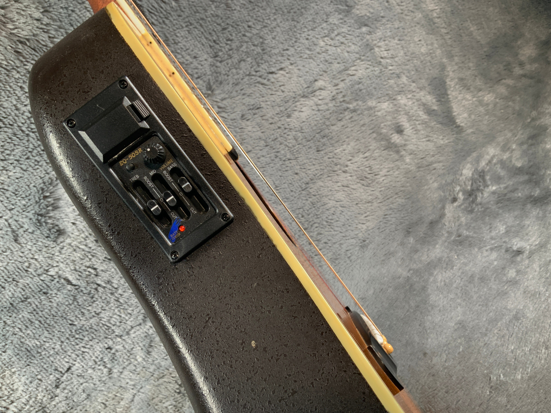 Электроакустическая гитара в стиле Ovation. Отлично звучит с подключением и в акустике. Установлены новые оригинальные американские струны D'Addario 11-52. Электроника переделана из пассивной в активную. Мензура 655 мм, верхний порожек 42 мм. Вес гитары 2,3 кг. Верх ель, корпус углепластик, гриф красное дерево покрытое масло-воском, накладка палисандр. Гриф ровный, лады без ямок с хорошим запасом, электроника в норме. Есть некритичные, возрастные царапины, потертости
