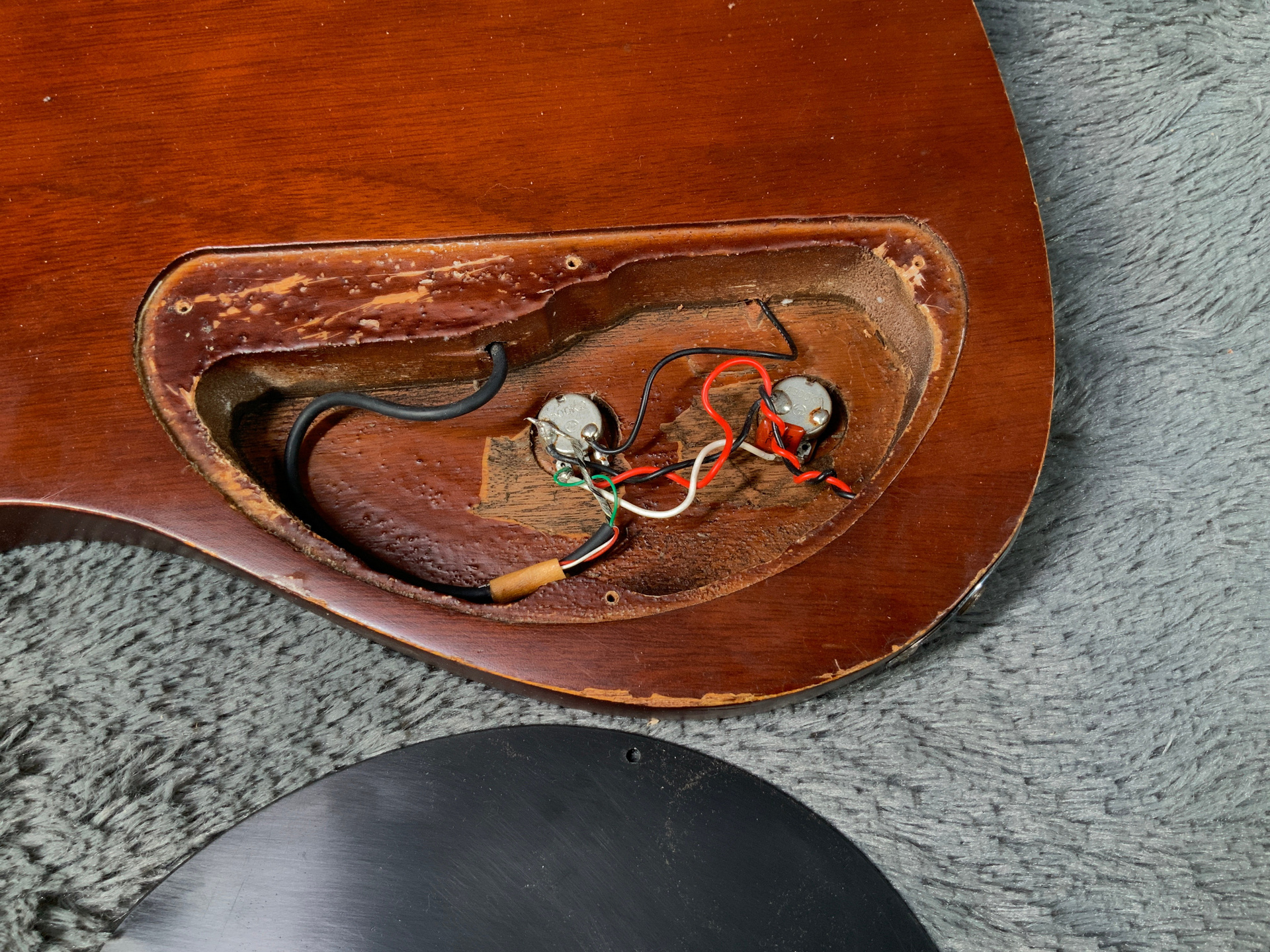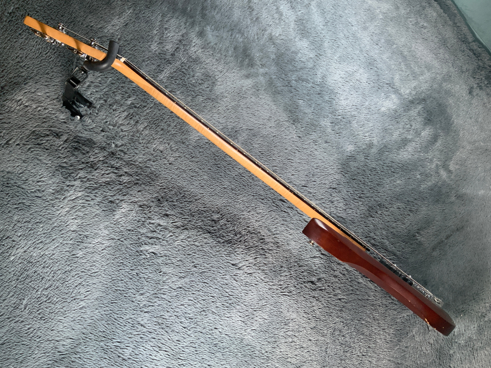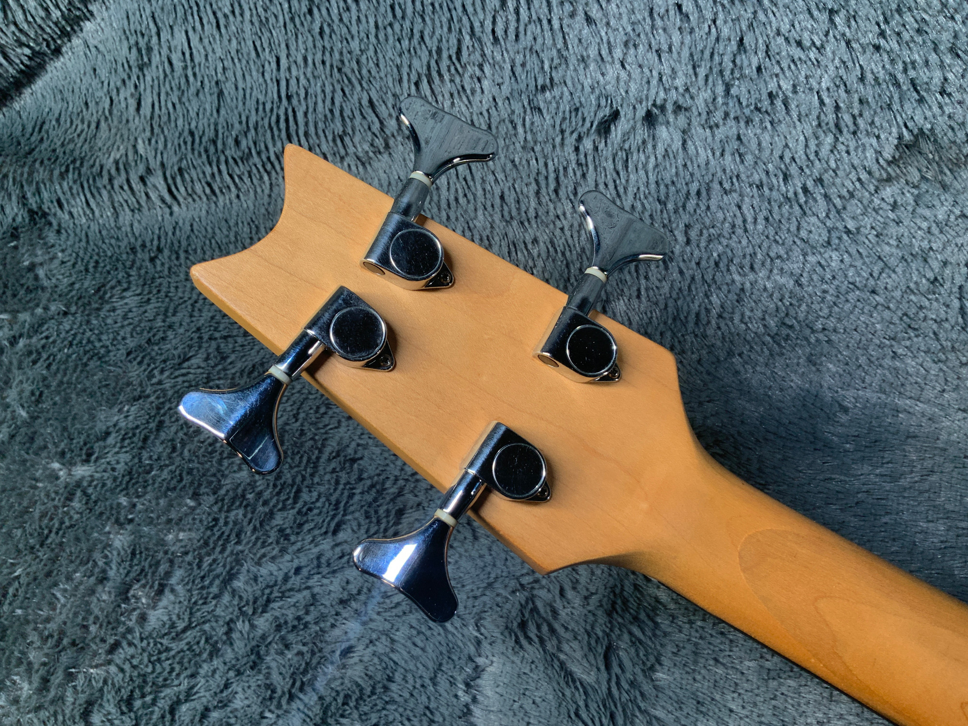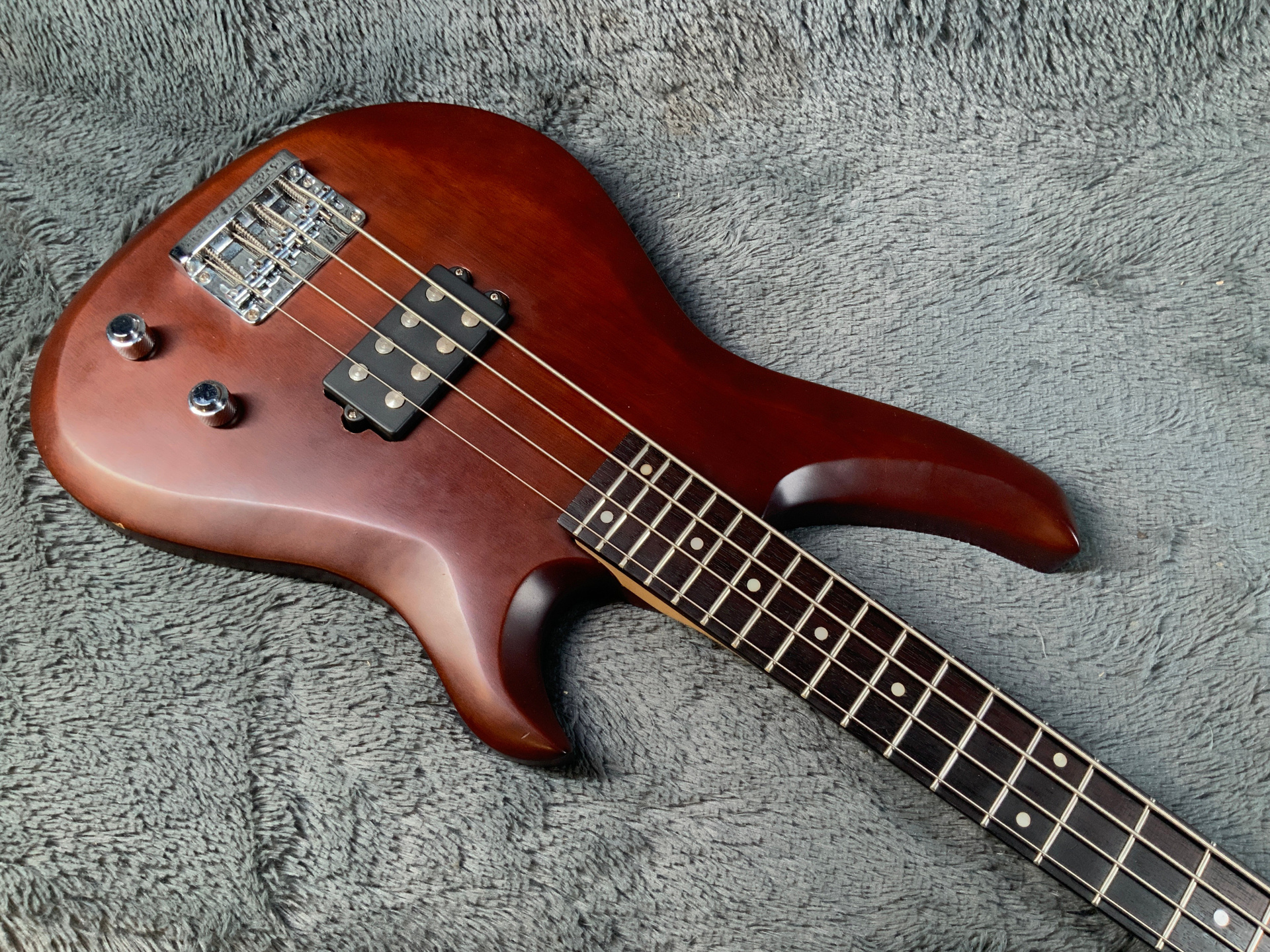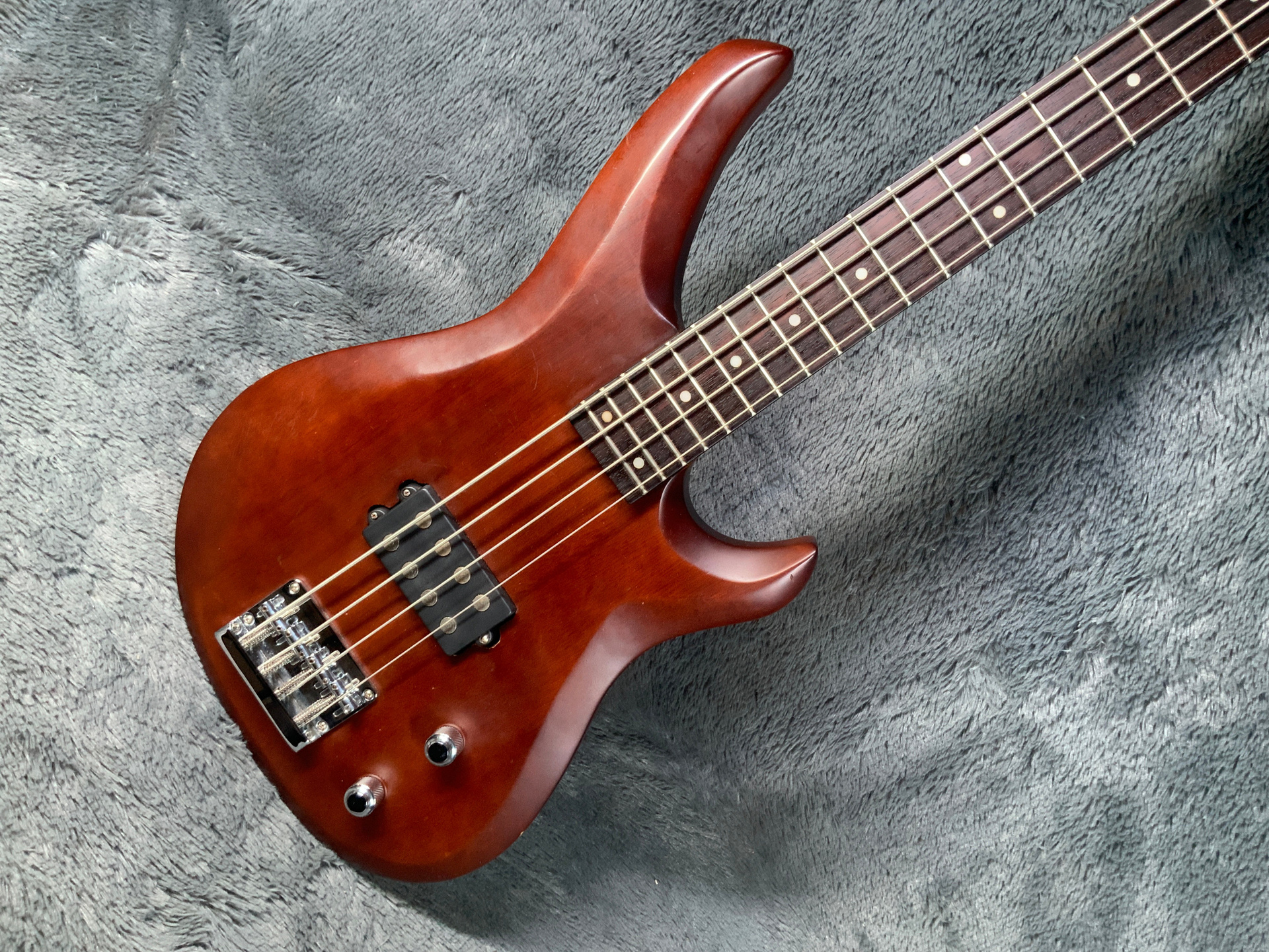 Красивый, эстетичный бас с хорошим звуком. Корпус из красного дерева, гриф кленовый с накладкой из темного палисандра. Мензура 870 мм, верхний порожек 43 мм, вес 3,4 кг. Датчик в стиле Musicman, звучит плотно. Управление громкость и тон. Анкер рабочий, лады с запасом, бас настроен для комфортной игры, нигде не цепляет, но в районе пятого лада есть небольшой горб — в идеале нужно шлифануть лады или накладку. Есть некритичные царапины, сколы